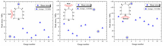 It can be seen from Figure 9, the maximum shear stress on the blasting side of the tunnel is mainly concentrated at the arch crown and arch foot. For example, when the blasting source was located from the left side, the shear stress at monitoring point #3 at the arch foot was 28.61 MPa. When the blasting source was located above the roof, the pressure at monitoring point #8 at the arch crown was 27.35 MPa. When the blasting source was located below the floor, the pressure at monitoring point #4 at the arch foot was 28.71 MPa. The distribution of shear stress is independent of the shape of the stressed surface, and the shear stress on the arch is even greater than that on the straight wall. Through monitoring data, it was found that the shear stress values at the symmetrical positions on the blasting side vary greatly; this may be caused by the inconsistent deformation of the tunnel after compression. Therefore, more attention should be paid to improving its shear strength when supporting the roof of the tunnel; this may be achieved through methods such as anchor bolts support.