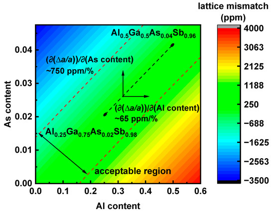 where is 5.6611 Å, is 6.1355 Å, is 5.6533 Å, and is 6.0959 Å. Linear interpolation Equation (1) is visualized in Figure 1. A 1% Al content deviation from the GaSb-lattice-matched condition will cause a 65 ppm lattice mismatch, and the same deviation for As content will lead to a 750 ppm lattice mismatch. A strict lattice match is unnecessary for thick-layer epitaxy. Maintaining a lattice mismatch within 1000 ppm is sufficient to effectively prevent dislocation generation. The line segment connecting Al0.25Ga0.75As0.02Sb0.98 and Al0.5Ga0.5As0.04Sb0.96 represents the ideal composition modulation process throughout composition-graded AlGaAsSb layer epitaxy, and the actual composition modulation process with a deviation within the marked acceptable region can also result in high-quality AlGaAsSb epitaxy. As Figure 1 illuminates, the Al content fluctuation is acceptable on the condition that the deviation from the designed value is less than 16%, and the As content fluctuation within 1.3% is acceptable. Therefore, precise As content control is much more essential for GaSb-lattice-matched AlGaAsSb quaternary epitaxy.