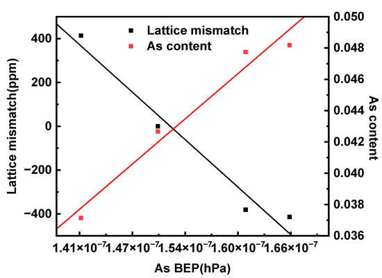 A linear relationship between the As content of AlGaAsSb and the As beam equivalent pressure (BEP) in low-As-content conditions has been reported [23]. An experiment was conducted to determine the As BEP dependence of As content in our equipment. The substrate temperature was calibrated by the 2 × 5 → 1 × 3 reconstruction transition of the GaSb surface, which is set as Tc, according to RHEED observations, and the growth temperature is 130 °C above Tc for high-quality AlGaAsSb epitaxy. The lattice mismatch was experimentally deduced from the HRXRD diffraction peak position difference of the epitaxial layer and substrate, according to Equation (2) [24].