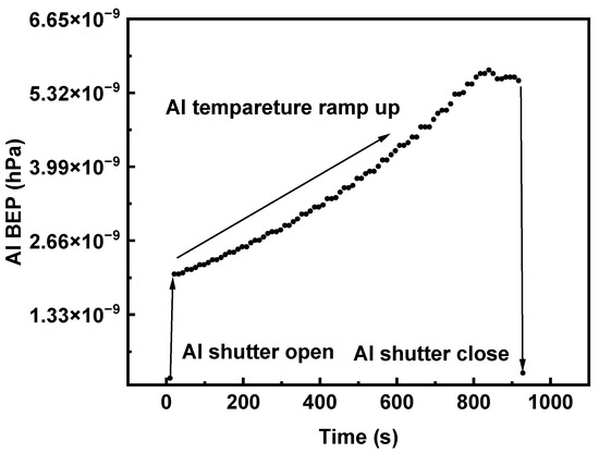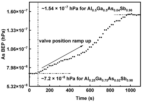 Valved cracker cells overcome the flux instability by providing a large reservoir of group V element vapor and controlling the flux with a needle valve. Real-time As flux monitoring and feedback control have been demonstrated by taking advantage of the rapid and repeatable flux response to the valve position [26]. In group V element composition-varying conditions, a step-like flux sequence is usually adopted to obtain the designed composition profile [27]. In this work, As BEP quasi-linear variation was accomplished by ramping the As cracker valve position to prevent background impurity incorporation induced by growth interruption. The As BEP is monitored by an ion gauge installed in the growth chamber. Figure 3 illustrates the As BEP profile obtained by ramping up the As valve position. The As BEP’s linearly ascending segment lasts for ~830 s, corresponding to the valve position ramp-up procedure. The valve position is fixed after the As BEP reaches the setpoint, and the As BEP is maintained for subsequent high-Al-content AlGaAsSb epitaxy. According to Figure 2, an 800 ppm lattice mismatch is the outcome of a 2.67 × 10−8 hPa As BEP deviation. Since an As BEP deviation within 2.67 × 10−8 hPa is acceptable for lattice-matched epitaxy, the demonstrated As BEP profile can be considered a linear modulation procedure, which is functional for composition-graded AlGaAsSb layer epitaxy.