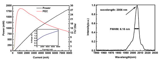 The potential barrier peak of the Al0.5Ga0.5As0.04Sb0.96/Al0.25Ga0.75As0.02Sb0.98 heterojunction is flattened after the introduction of the composition-graded AlGaAsSb layer, and a low series resistance of 0.144 Ω is obtained. The slope efficiency decreases from ~0.32 W/A with the increasing operation current, which is caused by heat accumulation in the active region when lasers are characterized in CW operation. As the actual temperature of the active region rises, the threshold current for lasering rises and the internal quantum efficiency is reduced, resulting in a low power conversion efficiency [30]. Due to the optimized mounting process, the heat generated in the lasers is dispersed quickly, ensuring a high slope efficiency in a wide operating current range and delaying output power saturation caused by thermal rollover. As a result, a high output power of 1.8 W is achieved at 8 A, while a high PCE of 28% is obtained at 1.1 A. Though PCE decreases with a higher current, it remains more than 12% at 8 A. The wavelength and FWHM of the laser operating at 3A are 2006 nm and 6.15 nm, respectively, since no additional longitudinal mode selection structure is adopted in our FP laser.