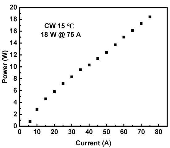 A 0.95 cm laser bar containing 19,500 μm wide emitters was 5% anti-reflection- and 95% high-reflection-coated and then mounted on a microchannel heatsink. Since the emitters in the laser bar are in parallel, the laser bar exhibits low-voltage, high-current, and high-power output performance. Nineteen emitters operating in parallel generate massive heat, and the heat distribution causes horizontal and perpendicular thermal stress in the laser bar and a consequent “smile” [31]. A microchannel heatsink with low thermal resistance and high heat flux is utilized to relieve heat accumulation and thermal stress. The laser bar with a 40% fill factor is characterized in CW operation at 15 °C. The CW performance is plotted in Figure 8. A record-high CW output power of 18 W is achieved at 75 A.