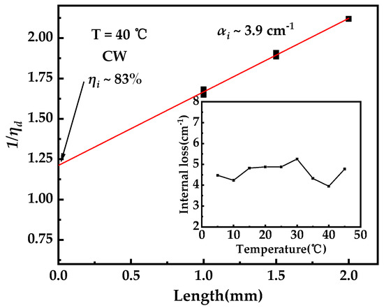 As expressed in Equation (5) [32], internal loss and internal quantum efficiency were determined with 1 mm, 1.5 mm, and 2 mm long uncoated lasers.