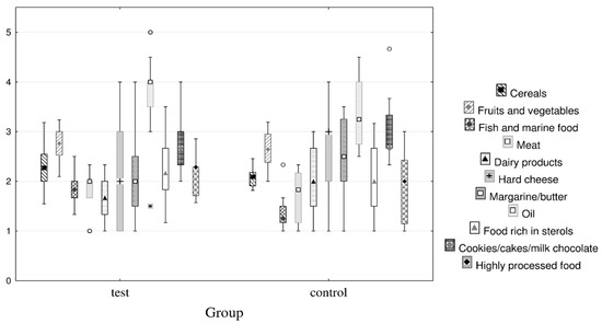 The diet of participants contained items from each food group. The consumption of biscuits/cake/milk chocolate (including some extremes) was higher while the consumption of fish and marine products was lower in the control group than in the test group.