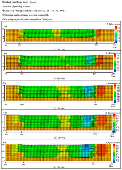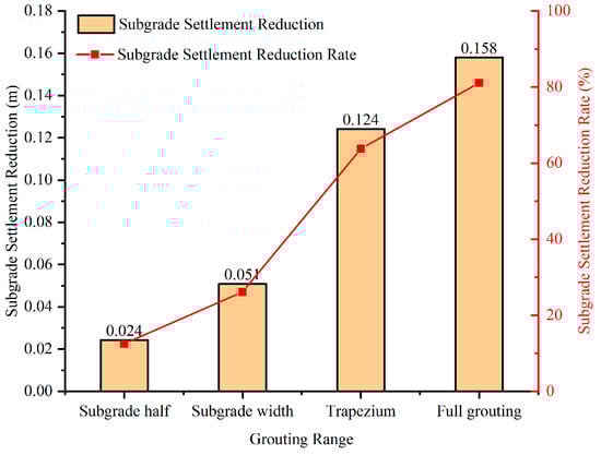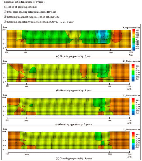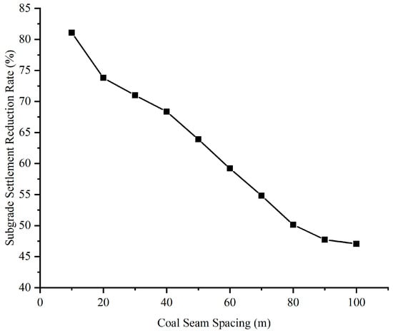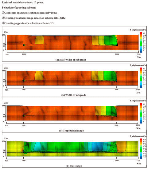 3.2. Calculation Results of Subsidence Reduction in Goaf Areas of Multi-Coal Seam Goafs with Different Grouting Ranges