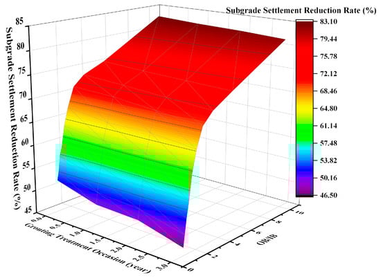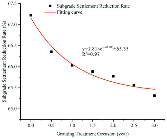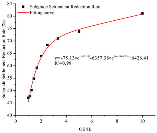 - For the grouting treatment of goaf areas with multi-coal seam goafs where mining has been stopped for a longer time, the central subsidence reduction rate of the subgrade is smaller, and there is an exponential relationship between the central subsidence reduction rate of the subgrade and the grouting opportunity. With the extension of grouting opportunity and the decrease in OB/IB, the subsidence reduction ratio at the center of the subgrade decreases in an exponential curve.