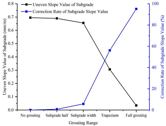 - When the treatment is performed according to the half-width of the subgrade, the width of the subgrade and the range of a trapezoid, the surface residual subsidence tends to the inclined ‘W’-shape of the open cutting. The surface residual subsidence has a symmetrical ‘W’-shape when full-range grouting is adopted. When the treatment width is selected as the width of the subgrade or half-width of the subgrade, the improvement effect on uneven subsidence of the subgrade is poor. When the treatment width is selected as the trapezoidal range and full-range grouting, the uneven subsidence of the subgrade is significantly improved.