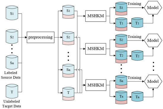 Denote an unlabeled data set from the target project as and some labeled data sets from multiple source projects as , , , where and denote the ith and jth instance in and , drawn from the marginal distributions and , respectively. denotes the label of the jth instance in . and are the number of instances in and , respectively, and n is the number of source projects. represents the metric value for the ith instance in the target project, while denotes the metric value for the jth instance in the source project . and represent the number of metrics for and , respectively. It should be noted that the metric size for the target and source data are different (i.e., ). Meanwhile, the marginal distribution of target data and of the source data also differ (). In other words, the metric sets of the source and target data sets are unlike, or heterogeneous. However, we need to train the model reasonably and effectively, by using labeled data sets from multiple source projects, to predict whether the labels of instances from the target project are defective. This requires that the data sets between the source projects and the target project are in the same feature space and subject to the same distribution. Consequently, we aim to identify a shared feature space for the target data set and multiple source data sets. According to the description above, the flowchart of the MSHKM algorithm is shown in Figure 4.
