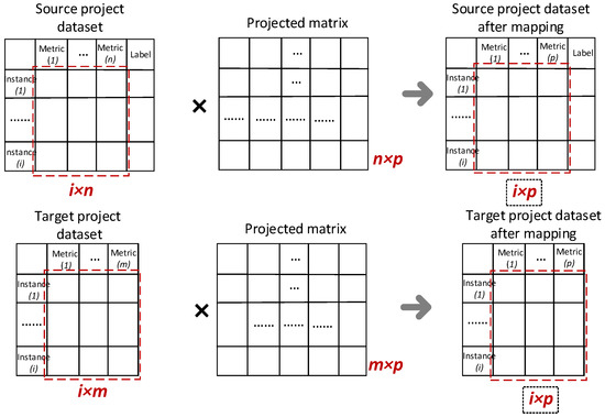 Multi-source heterogeneous kernel mapping (MSHKM) is based on heterogeneous mapping (HeMap) [24], and is similar to KSETE [17]. Different from KSETE, the input of MSHKM is multiple data sets of different dimensions, so, its feasibility needs to be proved from a theoretical perspective. The mapping principle of MSHKM is to multiply the data sets of source and target projects with different metrics into different projected matrices, respectively, in order to obtain data sets with the same metric feature space, as shown in Figure 3. Thus, the key is to determine the projected matrices. It should be noted that the number of instances for the source and target projects needs to be consistent, so under- or over-sampling technology should be used in data pre-processing.