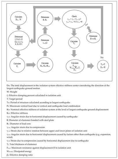 The design of seismic base isolators, according to TBEC 2018, is calculated based on the maximum displacement demand, target damping, and target period values. Base isolators reduce relative storey drifts by extending the structure’s period. As a result, the isolator stiffness is determined according to a longer target period value than a fixed-base structure. The isolators are sized by controlling unit deformation limits. The algorithm used in this study for isolator design is presented in the following Figure 2.