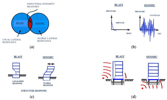 Comparison of blast and seismic loads: (a) Seismic versus blast overlap; (b) Seismic versus blast loading time histories; (c) Seismic versus blast response for fixed-base buildings; (d) Seismic versus blast response for base-isolated buildings [35].