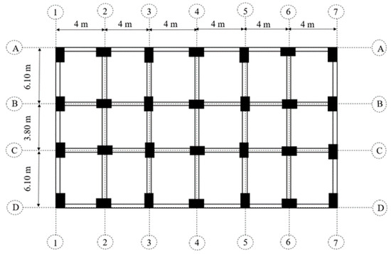 In this study, an existing school building was used in the analyses and a seismic base isolation design was made for this building. The existing structure was modeled as base-isolated using lead rubber bearings and the finite element method. In the building structural system, the columns were 350 × 600 mm in size and the beams were 300 × 600 mm in size, and the building storey plan is given in Figure 4. TBEC 2018 [31] was taken as a reference in the design of the dampers used in the base isolation. Detailed structure features are given in Table 4.