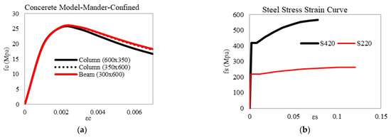 The existing structure was concrete class C25 and the Mander confined concrete model [36] was used (Figure 6). Longitudinal reinforcements were S420 steel grade and transverse reinforcement was S220 steel grade.