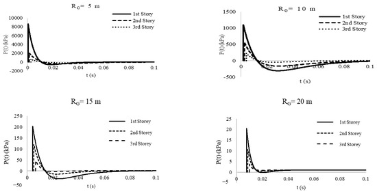 Scaling laws were used to estimate the blast loads to be impacted on the structure. Peak incident overpressure was obtained by obtaining blast load functions by keeping the blast load constant at different distances. Thus, an estimation was made about possible building damage using FEMA 426 [2] data (Table 1). In addition, an assumption that a hatchback was detonated was made to be used in calculations according to the explosive carrying capacity of the vehicles. Blast loads were obtained using Hopkinson scaling laws. Explosion effects were applied to each storey of the building at different distances, and load functions expressing the effects of the vehicles exploding at different distances on the storey levels were calculated and are given in Figure 7.