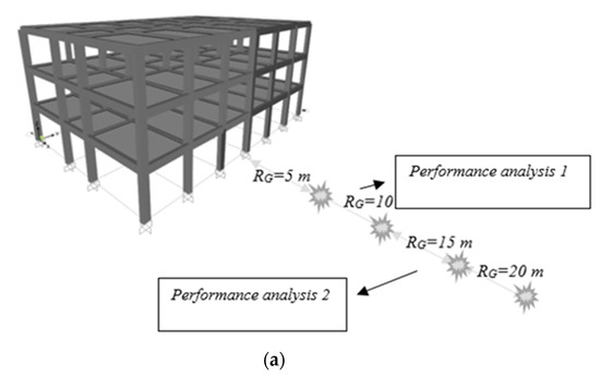 When the maximum explosion pressures are evaluated according to the distances, it is estimated that structures exposed to blast pressure in the range of 68.95–82.74 kPa will collapse according to Table 1. In the range of 12.41–20 kPa, it is expected that there may be collapses in the walls. In this case, a structure exposed to 227 kg TNT explosion from 5 m and 10 m distance is expected to be at the collapse level. Although it is estimated that the structure will be damaged at a distance of RG = 15 m and RG = 20 m, it is expected that the structural system will not be damaged at a distance of RG = 20 m. According to Table 2, it is seen that the columns reach the damage threshold when an explosion with the effect of 226 kg TNT occurs at 9 m. For this reason, in order to compare the explosion effects in structures with and without base isolation, performance analyses were conducted based on the assumption that a hatchback-type vehicle with a carrying capacity of 227 kg TNT for RG = 10 m (Performance analysis 1) and RG = 15 m (Performance analysis 2) was detonated (Figure 8a). In order to transfer the blast load to the structure, the unit area loads were calculated at each floor level along the surface of the building, and dynamic analyses were carried out in this way (Figure 8b).