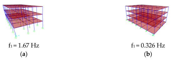 In the first stage of the study, modal analysis was performed in order to examine the effect of seismic isolation on the free vibration behaviour of the structure and, as a result of the analysis, free vibration mode shapes and frequencies were obtained for each system (Figure 9).