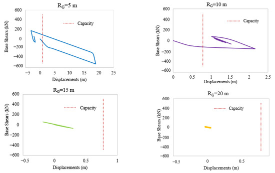 Comparison of hysteresis loops of the base isolators for different standoff distances under the blast load.