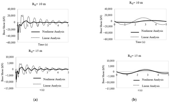 In order to compare the building performances at different standoff distances, the shear forces occurring at the base of the building and the storey displacements were compared for the limit RG = 10 m where the islator capacity was exceeded, and the distance RG = 15 m where the isolation unit was in the safe zone. The reason for not making any comparison for RG = 5 m is the very high excess of the capacity. The high explosion pressure at 5 m, according to the data given in Table 2, also supports the analysis results. The time dependent variation of the base shear forces occurring in the structure as a result of the explosion at RG = 10 m and RG = 15 m is given comparatively in Figure 11 for base-isolated and non-isolated structures, considering the linear and nonlinear behaviour. The change of distance significantly differentiates the explosion effects occurring on the structure. It is seen that the base shear forces decrease in the building where seismic base isolation was applied. When linear analysis and nonlinear analysis methods are compared, nonlinear behaviour and permanent deformations occurred in the structure in large explosive effects (close standoff distance or increase in explosive amount) and smaller base shear forces occurred due to ductility according to linear analysis.