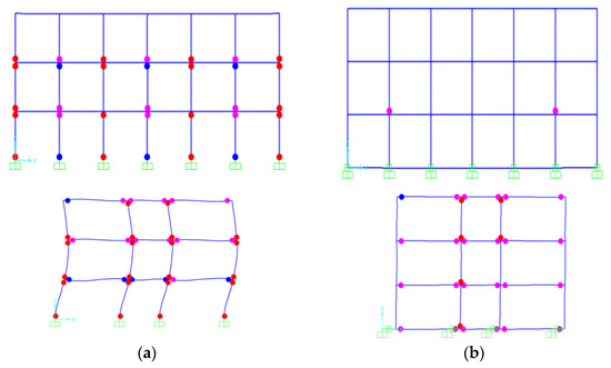 Plastic hinge formations in the base-isolated and non-isolated structures: (a) Plastic hinge formations for A-A and 1-1 Axis, at T = 0.1 s on non-isolated structure; (b) Plastic hinge formations for A-A and 1-1 Axis, at T = 0.1 s on base-isolated structure (Pink joints: Immediate occupancy, Blue joints: Life safety, Red joints: Collapse).