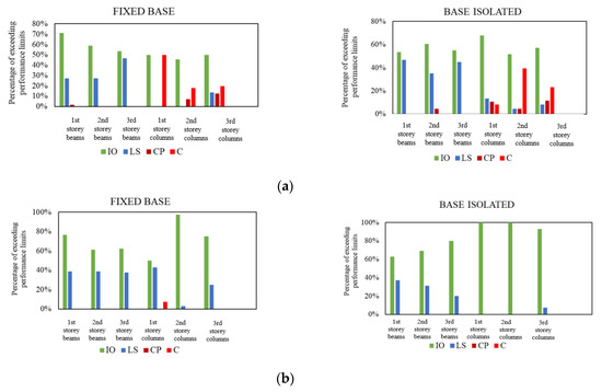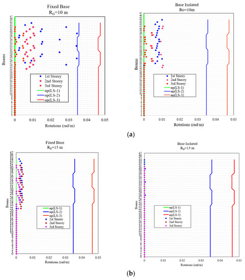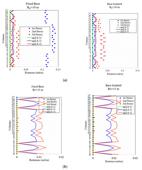 Plastic rotations for distances 10–15 m at columns for fixed-based and base-isolated systems: (a) Performance analysis 1; (b) Performance analysis 2.
