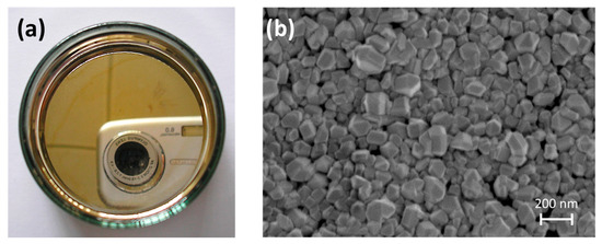 (a) Petri dish with SERS substrate, (b) SEM micrograph of SERS substrate.