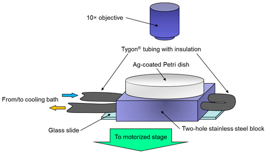 In our previous study, on the application of SERS for the determination of butylated hydroxyanisole in edible and essential oils [35], a special cooling system was developed to perform analyses at low temperature. Significant differences between room and low temperature were obtained due to the presence of very intense Raman shifts belonging to the oil, a complex matrix. In short, a Thermo-Haake K20 refrigerated bath with a C10 immersion circulator was used. A stainless steel block with two 8 mm holes was connected to the circulator by Tygon® tubing covered by air-conditioning pipe insulation. A Petri dish containing the oil samples was placed on the block, which was placed on the microscope stage. Raman spectra were recorded at −2 °C. Figure 2 shows a diagram of the system.