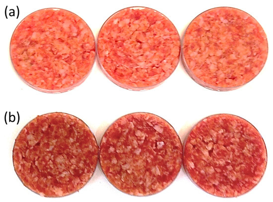 Aspect of meat samples stored at 5 °C after 5 days, where: (a) samples from conventional LDPE packaging, (b) samples from active packaging.