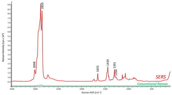 Spectrum of lipids extracted from ground pork after 0 days by SERS (red) and conventional Raman (green). Both spectra are shown on the same scale.