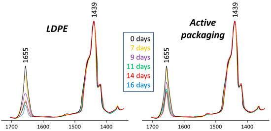The EFs were calculated from an analytical chemistry point of view [53,54] according to the formula EF = (ISERS/NSERS)/(IRaman/NRaman), where ISERS and IRaman were the signal intensities with and without silver substrate, respectively, NSERS the number of molecules responsible for the enhancement (first layer in contact with silver, ~8.4 × 106) and NRaman the number of fat molecules in the detection volume (~5.3 × 1011). The maximum EF values obtained were 1.64 × 107 at 1439 cm−1 and 8.58 × 106 at 1655 cm−1. These Raman shifts were chosen as reference for normalization (1439 cm−1, CH2 scissoring, which is relatively unaffected by oxidation) and for assessing oxidative fat degradation, which was mainly due to unsaturation (1655 cm−1, C=C stretching). Taking into account possible interferences, MDA, one of the main end products of lipid peroxidation, was considered as a reference. In a recent study [55], the MDA signal by SERS with mixed Au/Ag nanoparticles in the vicinity of 1655 cm−1, more precisely at 1663 cm−1 used by the authors for the effective measurement of a complex between MDA and 4-aminophenylthiophenol, was negligible. Since lipid peroxidation occurs mainly in unsaturated fatty acids, and double bonds between carbon atoms are lost in the process, the decrease in the peak at 1655 cm−1 can be satisfactorily attributed to lipid peroxidation. Figure 5 shows the overlapped spectra on different days showing both bands, corresponding to samples stored with LDPE (left) and with active packaging (right). It can be clearly seen that the decrease in the 1655 cm−1 band over time was much less pronounced in meat samples stored in active packaging. This demonstrates the protective effect of active agent by delaying fat oxidation.
