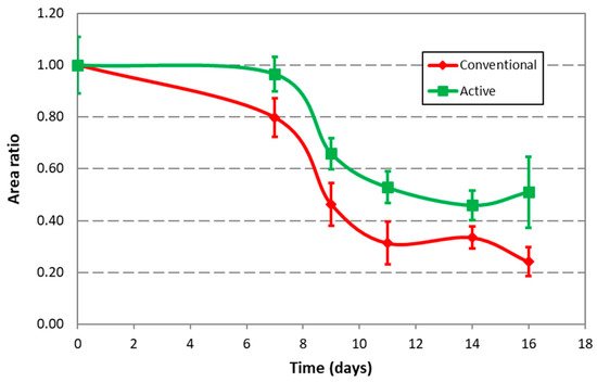 Figure 6 shows the graphical results of the SERS analysis, where a significant difference between conventional and active packaging was observed, as the error bars did not overlap. Therefore, the developed method can be successfully applied to monitor fat oxidation or to study the role of active packaging on fat and fatty products. Furthermore, a decreasing trend was observed from day 7 onwards. Again, since the active packaging always had a higher ratio area between 1655 and 1439 cm−1 bands compared to LDPE-packaged samples, it can be confirmed that the active packaging provided an effective reduction in unsaturation of fats as a consequence of their oxidation.