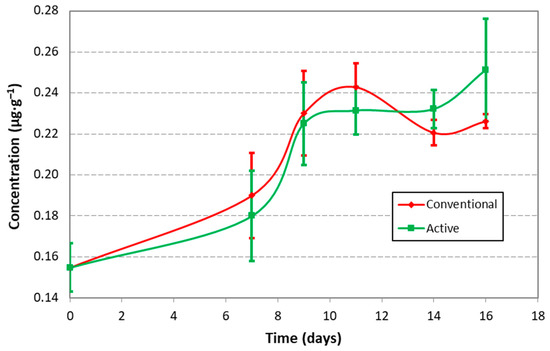 The quantification of MDA was performed by external calibration based on the measurement of absorbance. The linearity of the calibration curve was obtained in the range of 0.09–0.81 μg·g–1 nominal concentrations with regression coefficient (r) 0.9990. Figure 7 shows the obtained values of TBARS for the meat samples stored in different packages during the 16 days of storage.