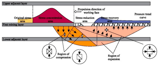 In the mining conditions of the short-distance coal seam group, the roof and floor of coal seam are displaced and deformed, generating cracks and forming gas migration channels. Based on the slip-line field theory, the coal and rock mass in a certain range under the stope floor lies in the stress cross area [22,23]. Under the action of shear stress, the floor coal and rock mass in the stress reduction area is easily further damaged in the edge area of the coal pillar and produces mining fissures. The supporting pressure range moves continuously with the advance of the working face. The damaged coal and rock mass moves to the goaf under the action of extrusion pressure, and the goaf floor expands to form a continuous sliding surface, as shown in Figure 1. At the same time, under the influence of ore pressure, the floor coal and rock mass are periodically destroyed, and the permeability is further increased. The pressure–relief gas of the underlying coal seam rises to the stopping layer along the fracture network through diffusion and seepage.