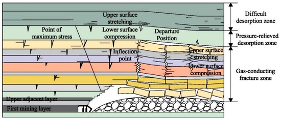 In the short-distance coal seam group, there is an obvious inflection point in the deformation and displacement of the roof strata. The upper and lower bearing surfaces of the rock stratum in front of the inflection point bear tensile and compressive stresses, respectively, and the upper and lower bearing surfaces of the rock stratum at the rear bear compressive and tensile stresses, respectively. Due to the heterogeneity of the rock strata, the ultimate tensile and compressive strengths of the rock masses within and between the rock strata are different. When the tensile and compressive stresses exceed the ultimate tensile and compression strengths of rock masses, there must be a transverse and longitudinal fracture network, as shown in Figure 2. Based on the co-mining theory of coal and gas, combined with the migration characteristics of pressure-relieved gas in the “three-vertical zones”, the overlying coal strata of the first mining seam in the short-distance coal seam group is divided into a “gas-conducting fracture zone”, “pressure-relieved desorption zone”, and “difficult desorption zone” [24]. There is a fracture network consisting of fractures along the seam and broken fractures in the gas-conducting fracture zone [25]. The gas in the adjacent seam can be fully relieved and flows into the mining seam. The gas in this area can be fully exploited, and its height is related to the location of the key seam [26,27].