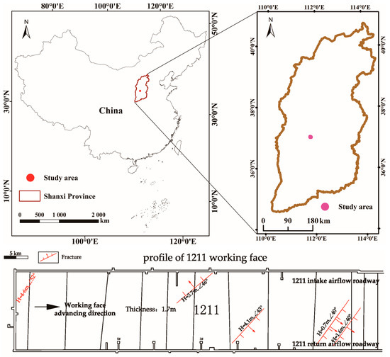 Shanxi Jinhui Wanfeng Coal Mine is located approximately 10 km southwest of Xiaoyi City, Shanxi Province, China. The topographic map of Wanfeng Coal Mine is shown in Figure 3. The No. 1-2 coal seam is mined at the 1211 working face, the average thickness being 1.5; the average buried depth is 540 m, and the gas content is 10.66 m3/t, and the gas pressure is 0.65 MPa. The permeability coefficient of the coal seam is 1.9358 m2/(MPa2·d). The average distance between the No. 1-1 coal seam and the No. 1-2 coal seam is 5.5 m, and the average thickness of the No. 1-1 coal seam is 0.64 m. The No. 1-1 coal seam belongs to the sporadic minable coal seam. The gas content is 9.71 m3/t, gas pressure is 0.62 MPa, and coal seam permeability coefficient is 0.3492 m2/(MPa2·d). The average distance from the No. 2 coal seam to the No. 1-2 coal seam is 6.95 m, and the average thickness of the No. 2 coal seam is 0.74 m. The No. 2 coal seam is unmineable. The gas content is 14.36 m3/t, the gas pressure is 0.66 MPa, and the permeability coefficient of the coal seam is 0.5698 m2/(MPa2·d). The rock column diagram is shown in Figure 4. The design strike length of the working face is 870 m, the inclination length is 170 m, and the average dip angle of the coal seam is 4°. U-shaped ventilation has been adopted.