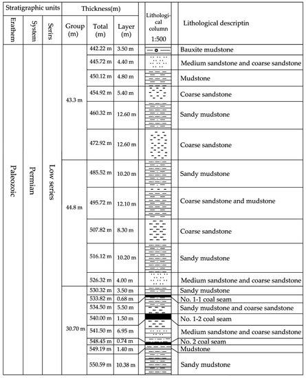 The physical and mechanical rock parameters were tested by coring detection within 30 m of the overburden coal and rock strata of the No. 1-2 coal seam roof. The compressive strength test is the ratio of the failure load to the bearing area of the standard specimen of coal or rock under uniaxial compression under laboratory conditions. The Brazilian splitting method was used to test the tensile strength; this experimental method determines the maximum tensile stress of a specimen by applying a radial compression line load to a solid cylinder specimen until failure. The elastic modulus was calculated according to the stress–strain curve [34]. The test results are shown in Table 2.
