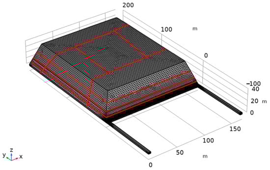 Taking the 1211 working face as the prototype, the gas flow in the goaf was simplified into a steady-state flow field, ignoring the influence of personnel and supports. COMSOL was used to construct the goaf data model. The calculation model simplified the working face, intake, and return air roadways as cuboids. The length of the working face was 170 m, and the height was 2.5 m. The distance from the rear boundary of the goaf calculation area to the working face was set to 200 m, the width of the inlet and return air roadway was 4 m, and the height was 2.5 m. The model was divided into multiple regions according to the different permeabilities. The middle of the goaf was the compaction zone, and the surrounding area was the “O” ring. The compaction zone and the “O” ring were divided into four regions from top to bottom; these included the upper part of the fracture zone. The lower part of the fracture zone, the upper part of the caving zone, and the bottom of the caving zone were investigated. The “O” ring was subdivided into 16 regions from front, back, left, and right. It was assumed that the permeability coefficients of each region were anisotropic and uniformly distributed. The grid was encrypted and divided into 410,000 units, as shown in Figure 5.
