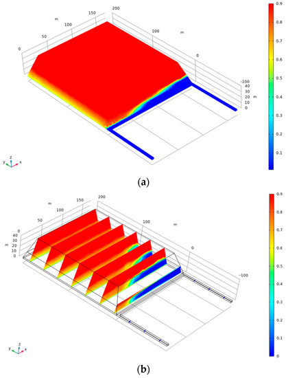 The gas quality sources in the model are set as the gas source of the coal wall, the residual coal in the goaf, and the gas emission source of the adjacent seam. According to the field measurement, the gas emission from the coal wall of the 1211 working face was 5.3 m3/min, and the gas emission from the residual coal in the goaf and the upper and lower adjacent seams was 19.3 m3/min. The gas emission in the model was regarded as continuous; that is, the gas sources in each area were averaged to the unit volume of the calculation domain, and the gas emission source of each area was determined according to Formula (3):