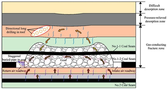 China’s gas disasters are extremely severe [1]. Ninety-five percent of high-gas mines are in low-permeability coal seams, and the adsorbed gas content accounts for more than 80% [2,3]. In a high-gas coal seam group, protective layer mining, combined with pressure–relief gas extraction, is the most economical and effective measure for gas disaster prevention and control [4,5,6]. However, with coal seam spacing of less than 10 m, no matter which layer is selected as the first mining protective layer, the adjacent layers are all in the pressure–relief range [7,8]. The gas in the pressure–relief state has the characteristics of a large desorption amount and a fast desorption speed [9]. Under the combined action of gas pressure and the negative pressure of ventilation, the pressure-relieved gas flows through overburden fractures to the mining layer [10]. At present, pressure–relief gas extraction is an effective technical measure to control gas in short-distance coal seam groups.