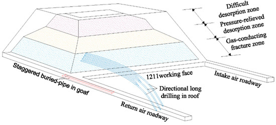 To prevent the hidden danger of gas accumulation caused by a large amount of pressure–relief gas from the upper and lower adjacent seams pouring into the 1211 working face during the mining of the No. 1-2 coal seam, it is proposed that directional long drilling in the roof combined with the staggered buried-pipe in the goaf be used to drain the pressure–relief gas from the adjacent seams.