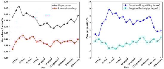 From Table 4, compared with working faces 1201 and 1209, which only adopted one treatment measure, the gas concentration in the upper corner of the 1211 working face with cooperative drainage technology was reduced to less than 0.7%, and the gas concentration in the return air roadway was reduced to less than 0.5%. The governance effect was best. In order to better understand the situation of pressure–relief gas control, the gas volume fraction of the return air roadway and upper corner of the 1211 working face and the gas extraction volume in the drainage pipes were monitored on site during the mining period from May 5 to 11–15, 2020, as shown in Figure 10.