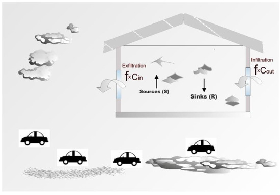 In each room or in an entire building, where air can be assumed to be well mixed, the rate of change of an air pollutant concentration can be described by a mass balance equation, as follows [37,38]: