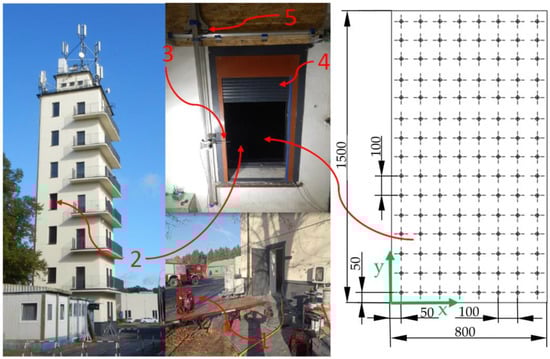 The flow tests were carried out in a 7-story building, inside which 4 storys (constituting a gas exchange line) were adapted for testing by sealing the remaining storys. Only 4 floors were selected for the tests, in order to maintain a compromise between the measuring range of the generated volume flow rates and at the same time maintaining the configuration reflecting the staircase of a multistory building. The tested cubic capacity (for 4 storys) was 198 m3, respectively. On the fourth story, in a window located on the southeast wall, a FRC test stand for evaluating velocity profiles had been installed, which is the equipment of Scientific and Research Centre for Fire Protection—National Research Institute, Jozefów, Poland [8]. The test stand consisted of the following elements: