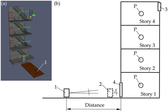Scheme of the tested system (a) 3D model, (b) schematic diagram, where: 1—PPV in the position of 7 m from the inlet, 2—PPV in the position 1 m from the inlet, 3—outlet from the building with the flow measurement system, 4—inlet to the building, P—pressure sensors on the story.