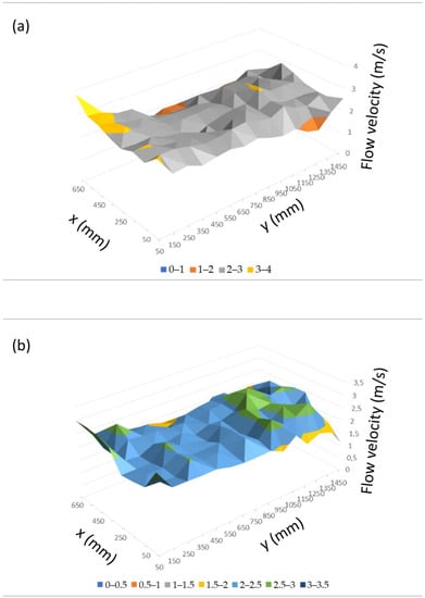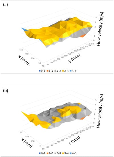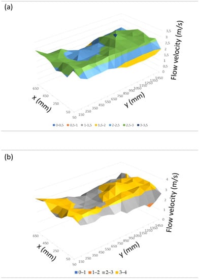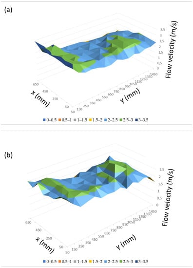 Air velocity in the outlet for positive pressure ventilator 2, positioned in front of the surface of the door opening, at distances: (a) 3 m and rotor axis angle to the ground 18°, (b) 4 m and rotor axis angle to the ground 12°.