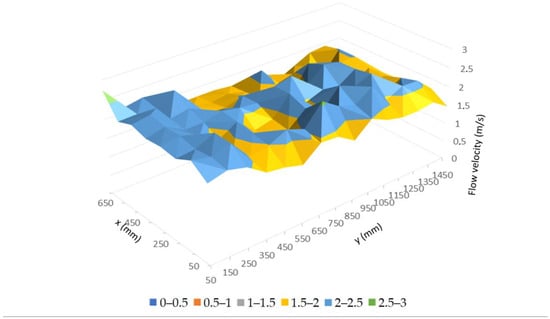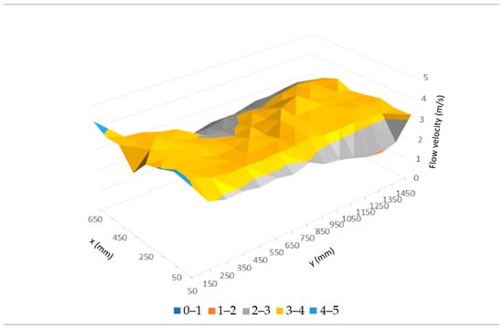 - Distribution of air flow velocity profiles on the surface of the outlet opening. The measurement was performed at 120 points located evenly on the surface of the FRC measurement plane. The measurement module was equipped with a TSI 8455 thermoresistive anemometer (with a measurement range of 0.127–50 m/s and an accuracy of 1%) (m/s).