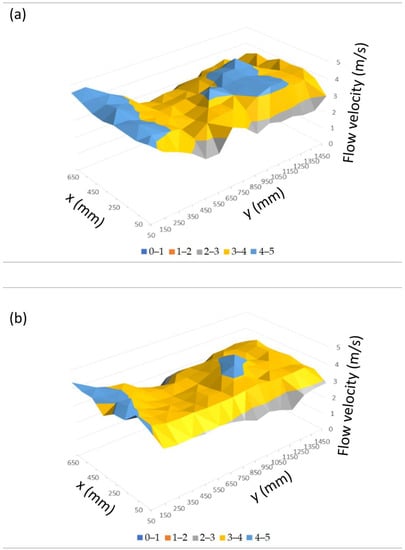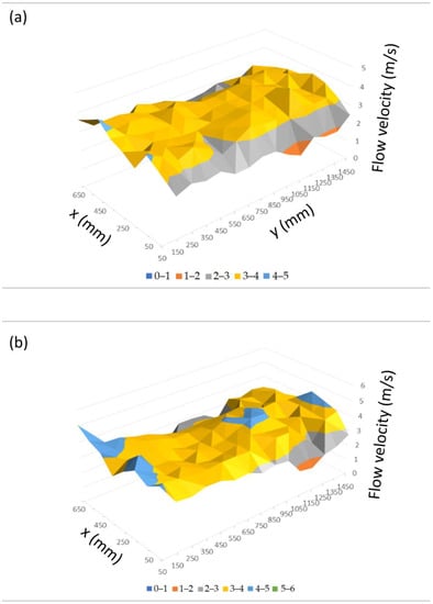 Air velocity in the outlet for positive pressure ventilator 2, positioned in front of the surface of the door opening, at distances: (a) 5 m and rotor axis angle to the ground 6°, (b) 6 m and rotor axis angle to the ground 6°.