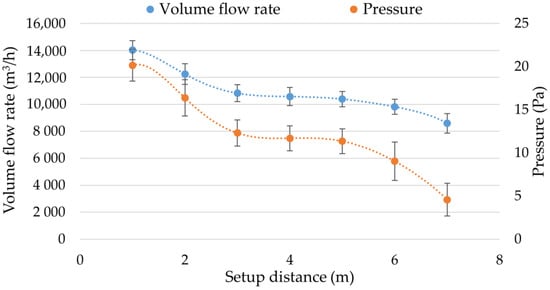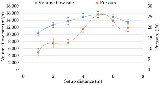 The effect of the distance of fan positioning on the flow parameters—volumetric flow rate and static pressure value—is shown in Figure 11 and Figure 12. The presented flow characteristics were made on the basis of the data in Table A1, Table A2, Table A3, Table A4 and Table A5. Analyzing the obtained test results, it should be pointed out that fan No. 1 achieved the highest efficiency when it was located at a distance of 1 m from the door opening. With these positioning parameters, the fan pumped 14,020 m3/h. The lowest efficiency of this unit was recorded for a distance of 7 m and was 8591 m3/h.