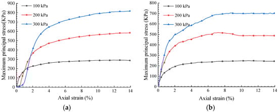 In the process of discrete element simulation, the necessary test parameters are usually obtained through laboratory tests to provide a data basis for discrete element simulation. The test soil sample selected in this paper is an unsaturated silt in Pingyuan County, Dezhou Qihe River Section of the Beijing-Taizhou Expressway. Firstly, the basic physical properties of the soil sample are obtained through the basic geotechnical test, as shown in Table 1. Then, the unconsolidated undrained shear test is carried out on the TSZ-6A strain-controlled triaxial apparatus to obtain the stress–strain relationship curve of the sample under different confining pressure conditions, as shown in Figure 4. The water contents of the soil samples prepared by the triaxial test are 15%, 18%, and 21%, respectively, and the circumferential confining pressures are 100 KPa, 200 KPa, and 300 KPa, respectively.