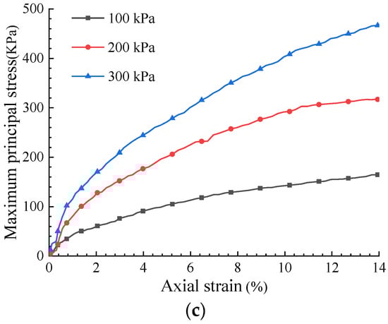 Figure 4. Stress–strain relationship curves of samples under different confining pressures. (a) Water content at 15%. (b) Water content at 18%. (c) Water content at 21%.
