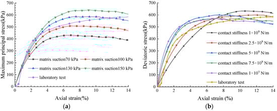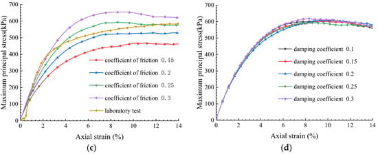 Based on laboratory test data, domestic and foreign scholars based the idea of inversion simulation [18] by changing the microscopic parameters of the model for a large number of static triaxial test discrete element simulations, the simulation results and laboratory test result comparative analysis through a trial and error method, to gradually determine the more reasonable discrete element model microscopic parameters. Figure 5a–d are the influence diagrams of the micro-parameters on the stress–strain curve when only the micro parameters, such as matrix suction, contact stiffness, friction coefficient, and damping coefficient, are changed. The indoor test data are the stress–strain curve obtained when the moisture content is 15% and the circumferential confining pressure is 200 kPa.